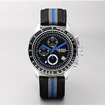 This timepiece by Fossil for men's offers a stainless steel case and canvas strap. The black dial includes a date window and chronograph function. This handsome watch also features a scratch-resistant mineral crystal a precise quartz movement and a water resistance level of up to 100 meters (330 feet).